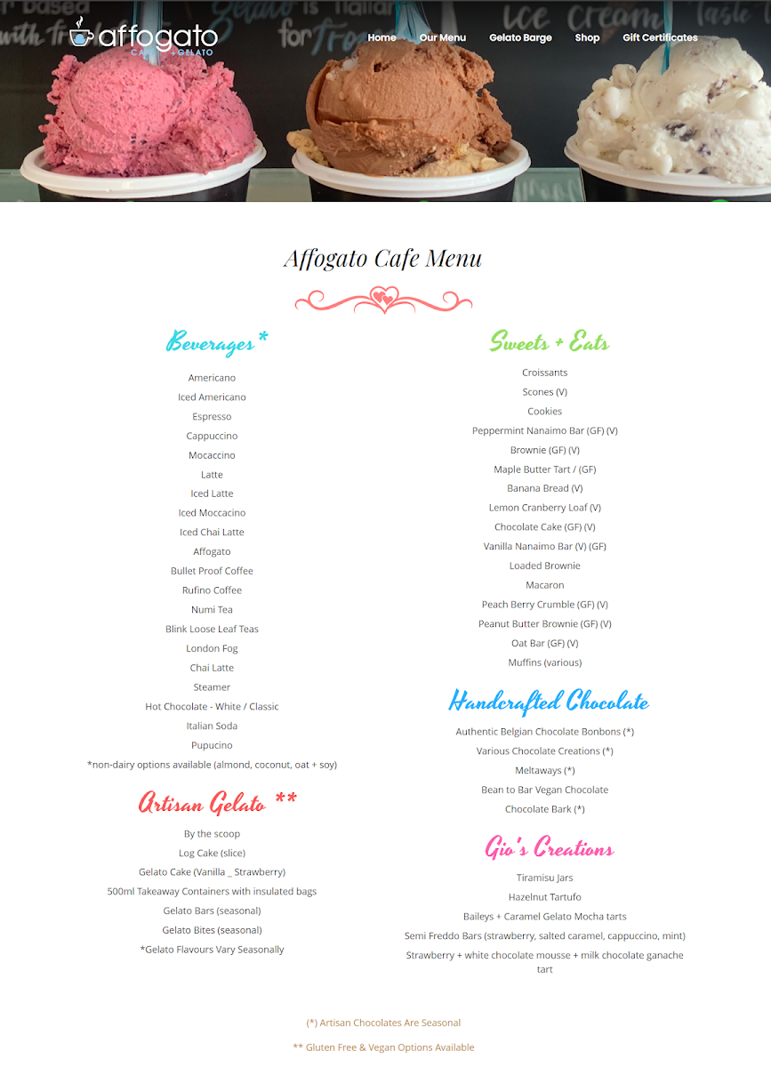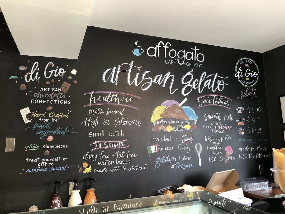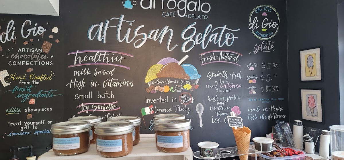 This place is a trendy, artisan cafe with a lot of options. We shared the Bird's Nest. Chocolate with a mango centre along with a coconut filling. It was fun to take photos of, even more fun to eat. We also got a vanilla hot chocolate and a latte. Had a chance to meet the owner. This young man is an artist. He makes so many of the food items himself and he creates artisan Gelato. You can try the flavours before you buy. Ended up buying Nirvana to take home (note ask for a freezer bag). We had it later that night, it was Salted Caramel with some Peanut butter and rice krispies. It was amazing. The decor gice an upscale yet chill vibe. The staff is friendly and welcoming. We will be back in Huntsville in the summer and a stop back here is a must.